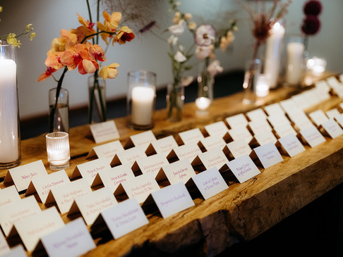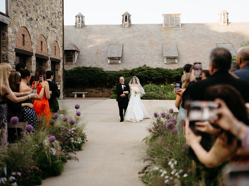 Juliana and Antonio loved the elegant but effortless charm of Blue Hill and we wanted to find ways for the flowers to echo the spirit of the venue. We looked through a lot of photos together and kept coming back to one which had grasses and textures punctuated by more sculptural blooms. It felt unfussy and cool with the bold colors and graphic shapes and mimicked the ample garden beds at the venue. We followed this inspiration direction for the aisle, keeping things very textural with grasses, ferns, and small blooms. Large globe and schubertii allium really stood out against this design and created a dynamic pathway to their altar, which was a statement-making backdrop for Juiliana and Antonio's vows filled with lush, cascading orchids. The arrangements for the reception introduced some warm pops of peaches, coral, and yellow and we wanted to keep the design fun and expressive with gestural stems, unique flowers, and asymmetrical shapes. Unexpected prints, patterns, and pops of color made the design feel chic and romantic while fitting in perfectly to the garden-like feeling. Photography : Forged in the North Planning : Ashley Peraino