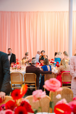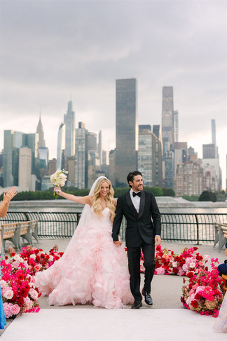 Rachel and Leo created so many special, personal elements for their wedding to share their love story with their family and friends. Their day was filled with meaningful moments, starting with their vows with the skyline of Manhattan as their backdrop and a stormy sky that cleared just long enough for them to say 'I do'. A low floral arch mimicked the layers and ruffles of Rachel's custom pink Hayley Paige dress. Inside Sound River Studios, they transformed their reception space into the ultimate chic, vintage wedding with yards of pink draping, a baby grand piano, and a custom pink checkered floor. The flowers introduced a romantic, playful aspect that perfectly encapsulated a classic ambiance. Lush roses in reds and pinks surrounded them for their first dance and champagne toast, while more sculptural red anthuriums peeked out of the centerpieces between tall taper candles for the an intimate, candlelit dinner.